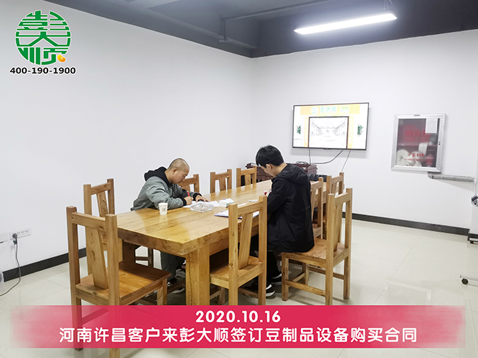徐老板就擔(dān)心自己買了豆腐機(jī)設(shè)備但是做不出來好味道,到了彭大順現(xiàn)磨豆腐坊之后,現(xiàn)場(chǎng)品嘗了解后一切擔(dān)憂都解決了,于是愉快的與彭大順簽單達(dá)成合作,訂購小型豆腐機(jī)一套!