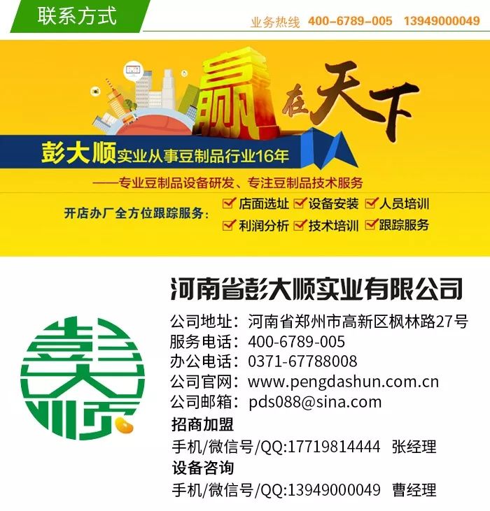 彭大順豆腐坊加盟公司總部為客戶提供店面選址、裝修設計、開業(yè)手續(xù)辦理、設備定購、技術培訓、開業(yè)儀式、分析市場、店鋪運營策劃等全方位的技術性服務和一站式幫扶服務,爭取讓每一位加盟者都能輕松開店獲取盈利。蘇先生之前沒有做過豆制品生意,選擇加盟項目最合適不過。蘇先生在來之前就已經決定加盟彭大順項目的,他已經在農貿市場租下了一間合適的店鋪,準備做批發(fā)加零售形式經營。