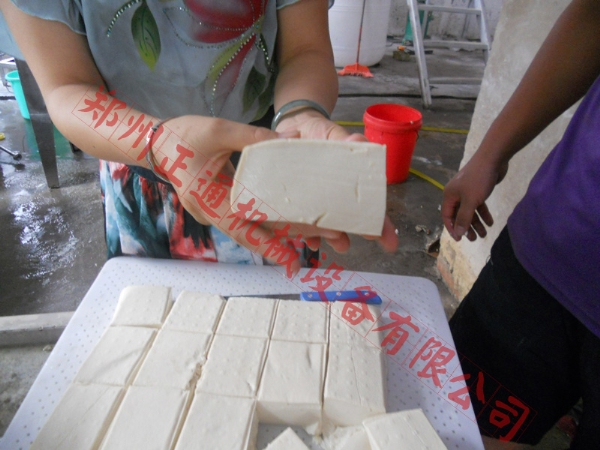 ?? 4、再制成自己需要的豆腐如水豆腐,豆腐花凝結(jié)約15分鐘內(nèi),用勺子輕輕舀進已鋪好包布的木托盆(或其它容器)里,盛滿后,用包布將豆腐花包起,蓋上板,壓10~20分鐘,即成水豆腐?;蛑贫垢?。將豆腐花舀進木托盆里,用布包好,蓋上木板,堆上石頭,壓盡水分,即成豆腐干。一般10公斤黃豆可制25公斤豆腐干。