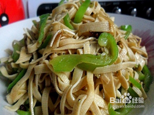 將豆腐皮切絲,青椒洗凈切成絲,蔥洗凈切段,鍋內(nèi)加入水燒開,放入豆腐絲焯水后撈出,鍋內(nèi)放適量油燒熱,放入花椒變色后撈出不用,放入蔥段爆香,入豆腐皮絲翻炒,加入鹽,少量糖翻炒一會兒,再加入青椒絲稍炒兩下,加入雞精、滴入少許麻油即可出鍋。
